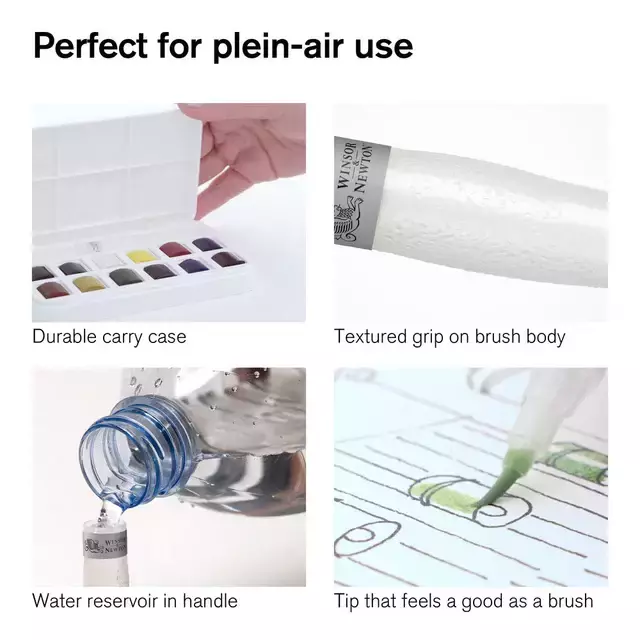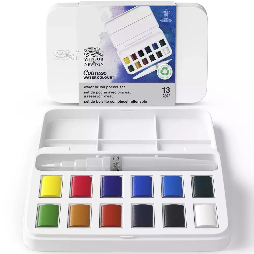 Descubra 12 acuarelas Cotman elaboradas con pigmentos de alta calidad para bellas artes en un estuche de bolsillo. El pincel de agua incluido en este estuche cuenta con un depósito de agua integrado en el mango, lo que lo hace perfecto para usar en exteriores. El estuche de bolsillo de pinceles de agua se conocía anteriormente como estuche de pincel.